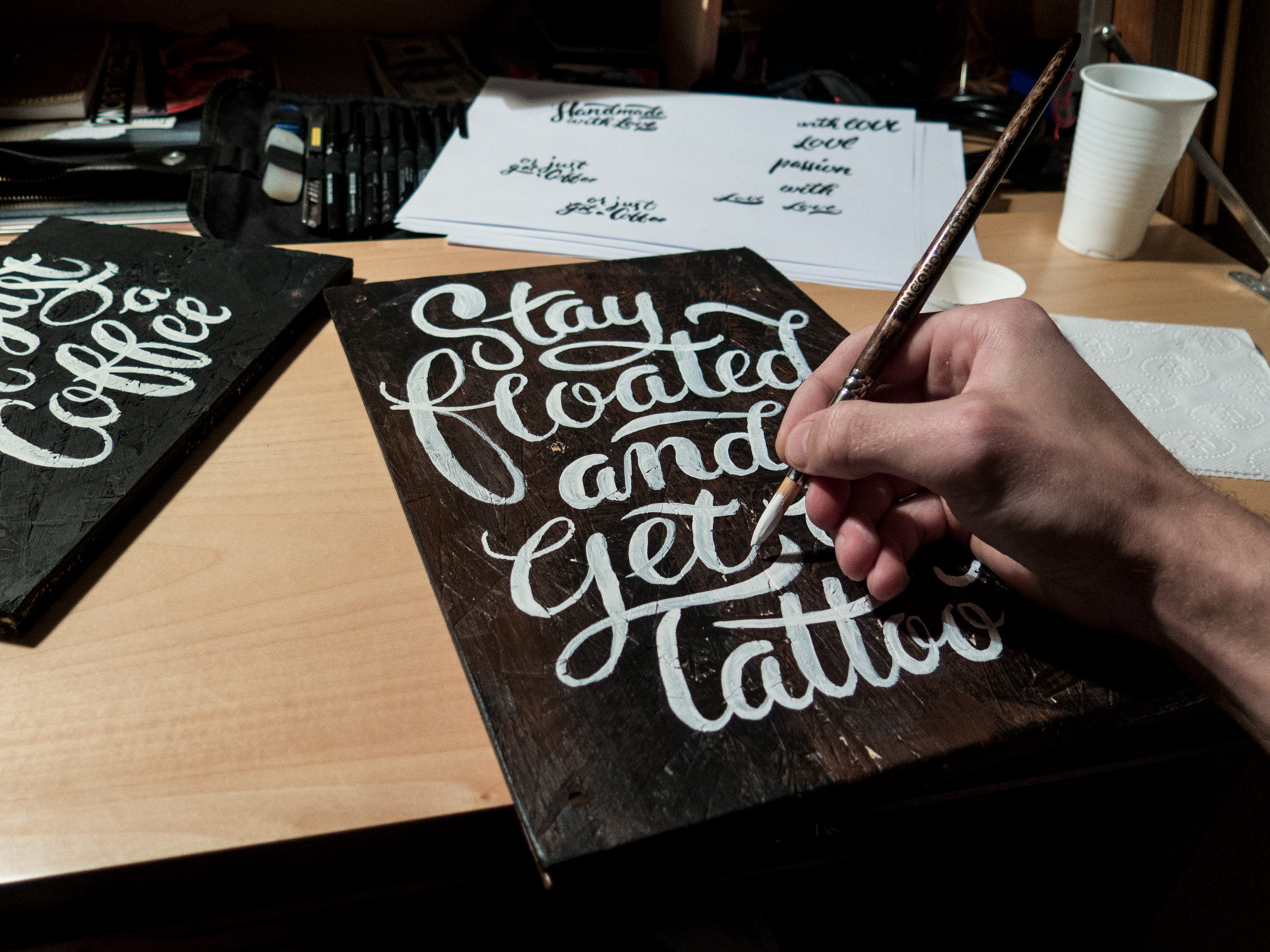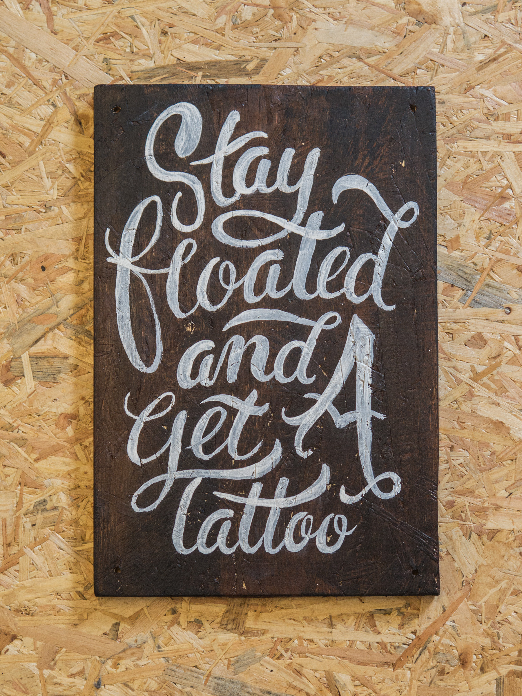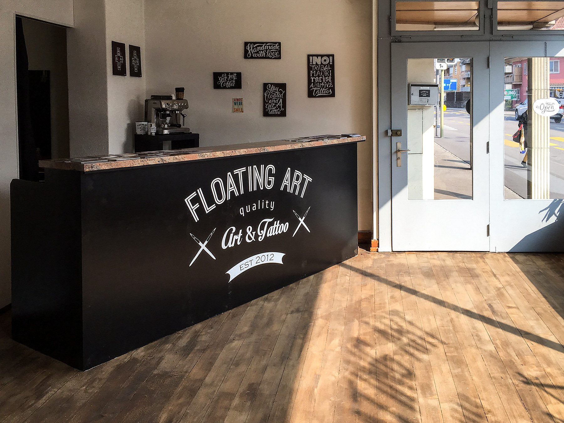 Handgemalte Schilder für das Tattoo Studio "Floating Art" in Thun. Kunde: Floating Art – Tattoo Studio Lettering: Reto Meyer Entstehungsjahr: 2016