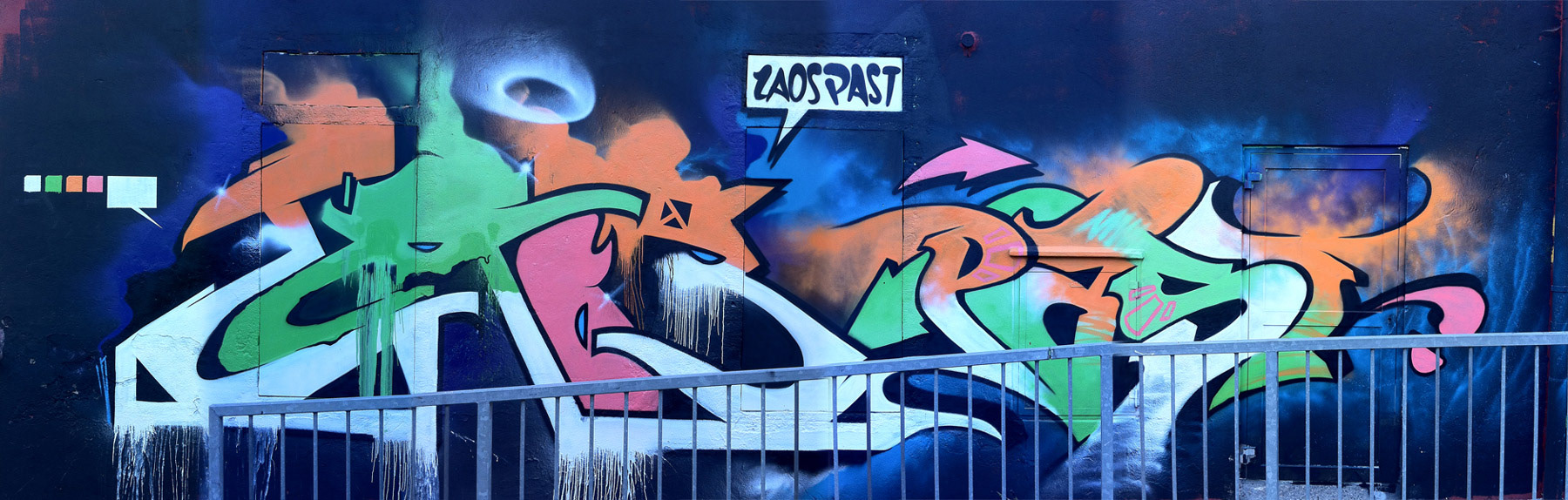 Konzept-Graffiti zusammen mit LAOS am Kulturhaus und Jugendwerkhof Tomassini in Lenzburg. Persönliche Arbeit Skizze und Umsetzung: Reto Meyer Entstehungsjahr: 2013